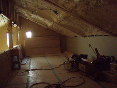 階段がついたのでロフトの床貼りもはしごよりずっと楽ですね~