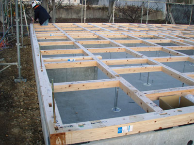 前日に建て方大工さんが土台伏せをしてくださっています。