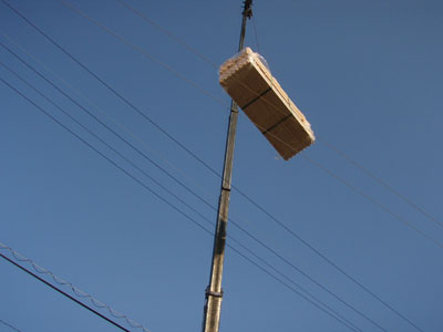 レッカーさん、電線の間を通してます